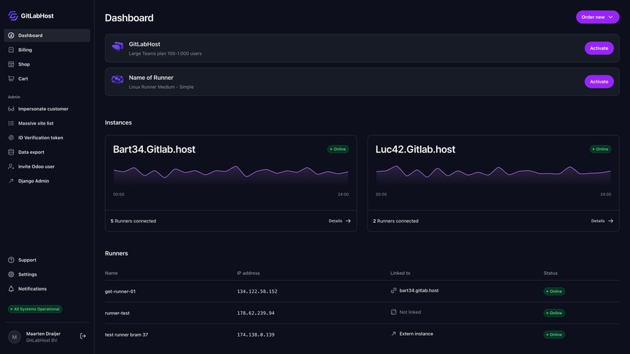 I built the GitlabHost dashboard front end from design to shipped UI. It brings onboarding, instance and runner management, billing, support, and account settings into one product that feels consistent day to day.